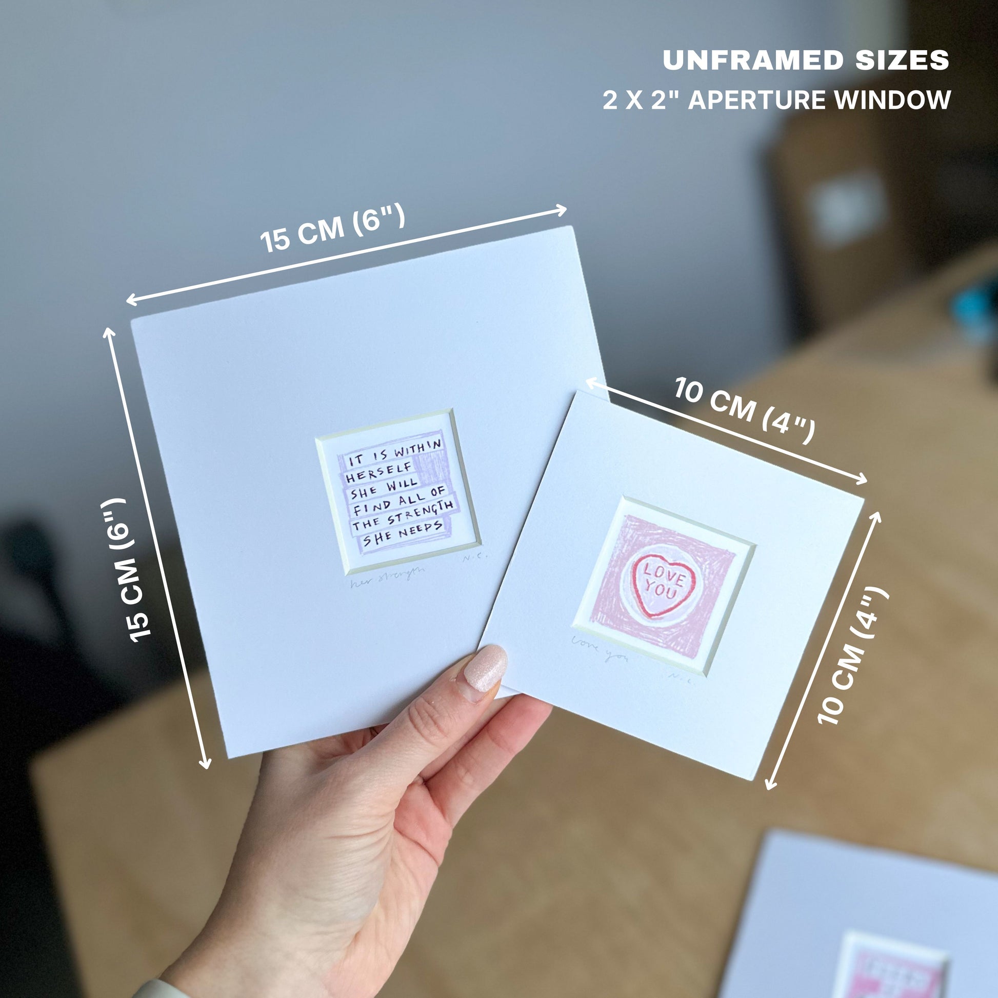 - Size (with mount, unframed): 4” x 4” (10 x 10 cm), Size (with frame): 125 mm x 125 mm x 35 mm.